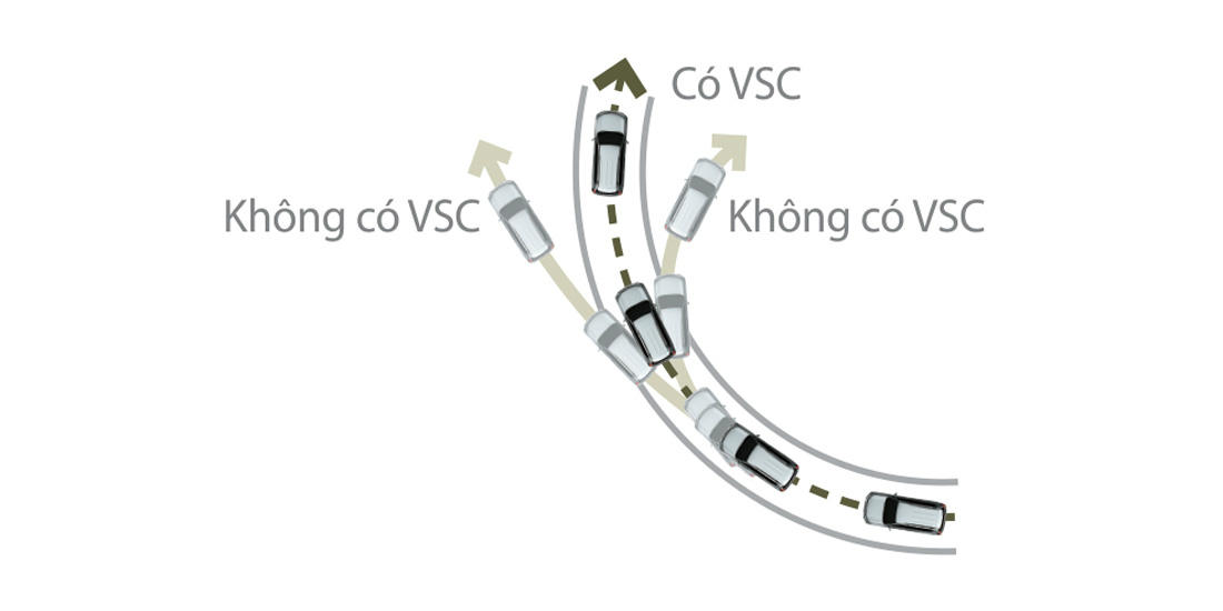 Hệ thống kiểm soát ổn định xe VSC tự động giảm công suất động cơ và tự động phanh ở các bánh xe trước và sau khi có hiện tượng thiếu lái và lái quá đà lúc vào cua nhằm ngăn ngừa hiện tượng chệch hướng.