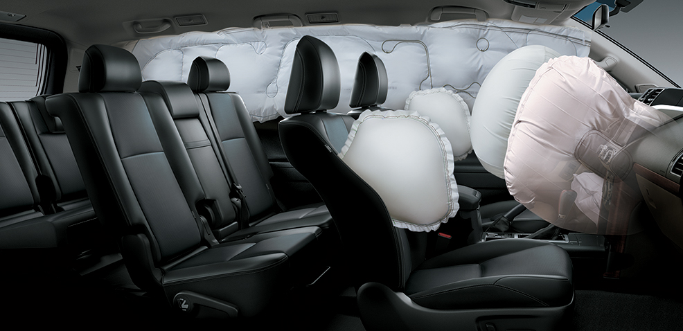 Trong trường hợp không may xảy ra va chạm đến mức thiết kế, các tín hiệu bung túi khí sẽ được phát ra. Tùy theo vị trí & mức độ va chạm, 2 túi khí phía trước sẽ bung ra bảo vệ phần đầu và ngực người lái & hành khách phía trước cùng với túi khí bên hông; đồng thời túi khí đầu gối giúp bảo vệ chân người lái không bị chạm vào chân ga cũng như các thiết bị khác.