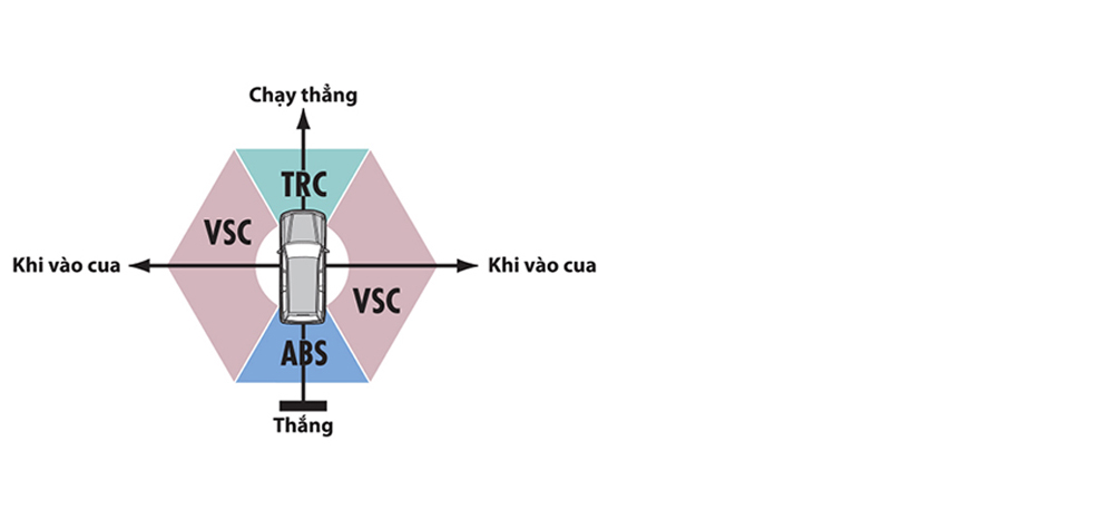 Hệ thống kiểm soát ổn định xe VSC tự động giảm công suất động cơ và tự động phanh ở các bánh xe trước và sau khi có hiện tượng thiếu lái và lái quá đà lúc vào cua nhằm ngăn ngừa hiện tượng chệch hướng.